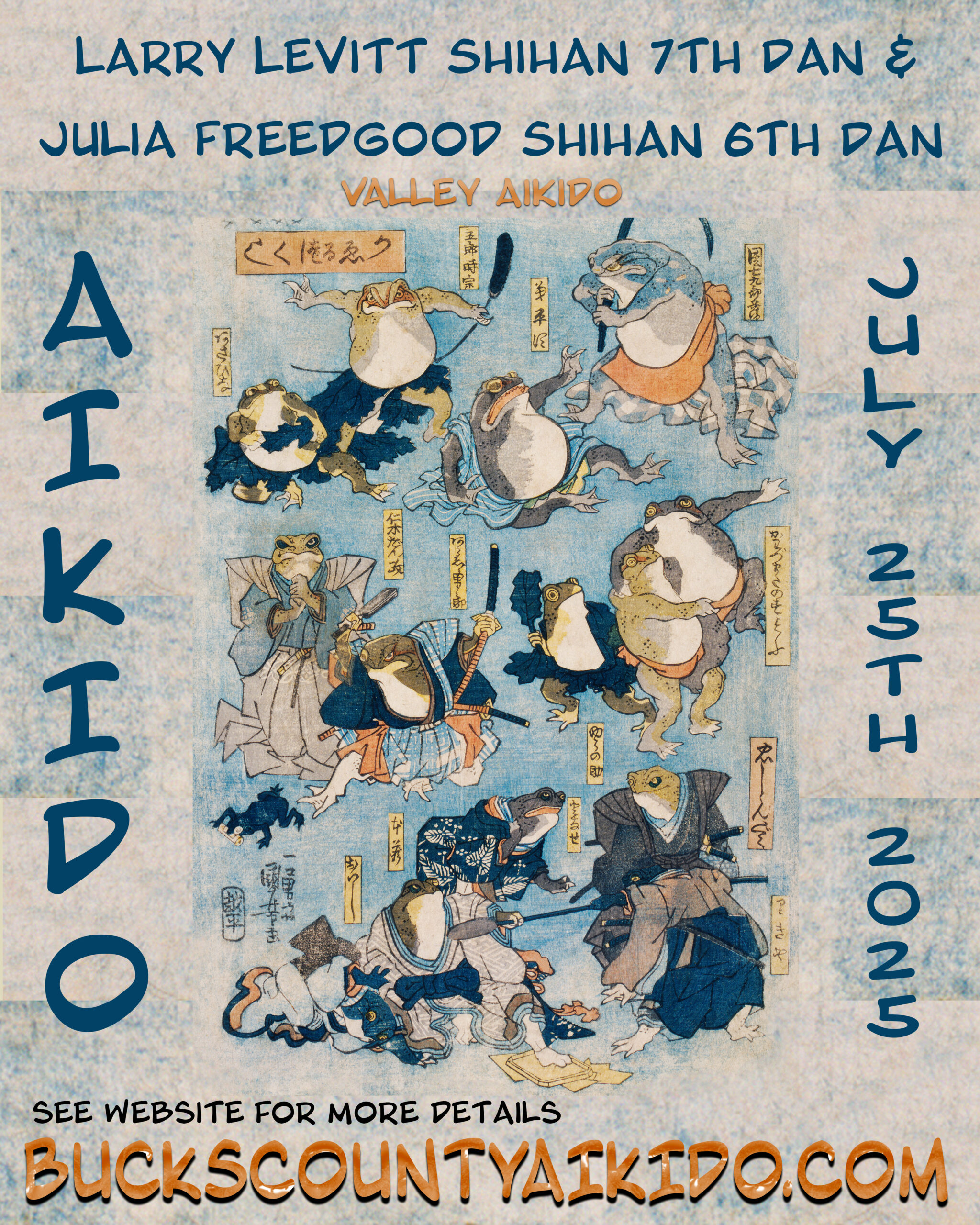 Join us July 25th, 2025 for a one day seminar with Larry Levitt Shihan 7th Dan and Julia Freedgood Shihan 6th Dan of Valley Aikido, Northampton, Massachusetts.